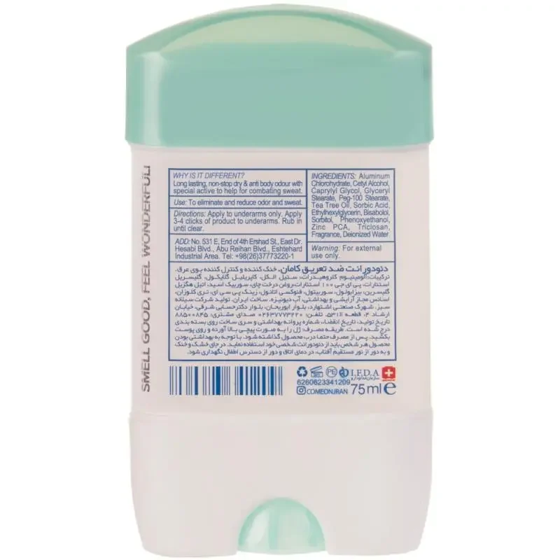 ضدتعریق زنانه کامان مدل Long Lasting ماندگاری 24 ساعته، رایحه و خاصیت ضدتعریق دارد و دارای رایحهای قوی جهت جلوگیری از عرق و افزایش تنفس پوستی است و در تمام طول روز با رایحهای بسیار مطلوب حس تازگی و پاکیزگی را ایجاد میکند. ژل ضدتعریق کامان همچنین دارای عصاره درخت چای نیز است که میتواند با داشتن خواص ضدباکتری خود، باکتریهای سطح پوست را از بین ببرد و از بوی بد عرق جلوگیری کند و سفیدک و لکه بر روی پوست و یا لباس ایجاد نمیکند.