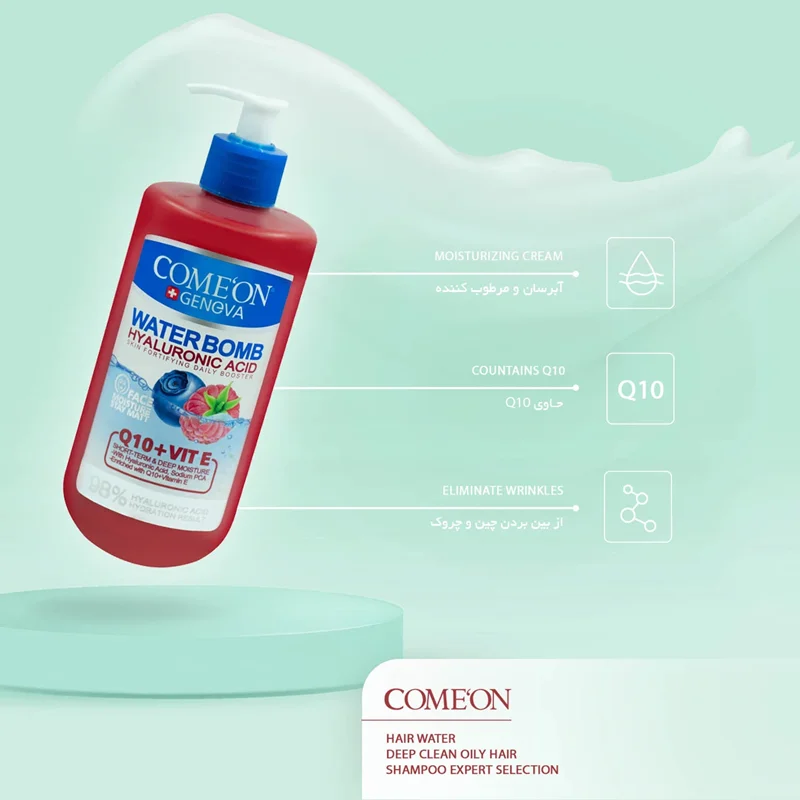 بمب آبرسان کامان مدل Q10 با ظرفیت 500 میلی لیتر حاوی کوآنزیم Q10 و ویتامین E است که به حفظ رطوبت پوست کمک کرده و پوست را نرم و لطیف میکند. همچنین سرشار از آنتی اکسیدانهای گروه میوههای Berry است که با آبرسانی فوق العاده پوست از ایجاد علائم پیری زودرس، چین و چروک های پوستی جلوگیری میکند. کرم آبرسان کامان بلافاصله بعد از استفاده جذب پوست میشود و هیچ گونه احساس چربی و سنگینی روی پوست ایجاد نمیشود.