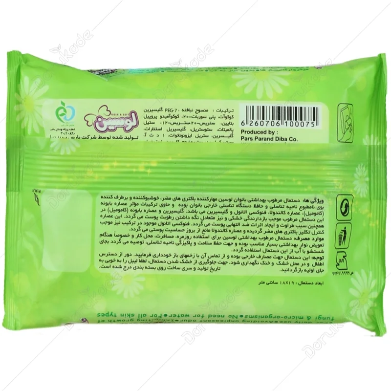 دستمال مرطوب بهداشتی بانوان لوسین مهار کننده باکتری های مضر، خوشبو کننده و برطرف کننده بوی نامطبوع ناحیه تناسلی و حافظ دستگاه تناسلی خارجی بانوان بوده و حاوی ترکیبات موثر عصاره بابونه (کامومیل)، عصاره کالندولا، فنوکسی اتانول و گلیسیرین می باشد. گلیسیرین و عصاره بابونه (کامومیل) در این دستمال موجب بازدارندگی خشکی و نیز متعادل نگه داشتن رطوبت پوست می گردد. این عصاره همچنین سبب طراوت و ایجاد اثرات ضد التهابی پوست می گردد. فنوکسی اتانول موجود در ترکیب نیز موجب کنترل تکثیر باکتری های مضر گردیده و عصاره کالندولا مانع از بروز حساسیت پوستی می گردد.