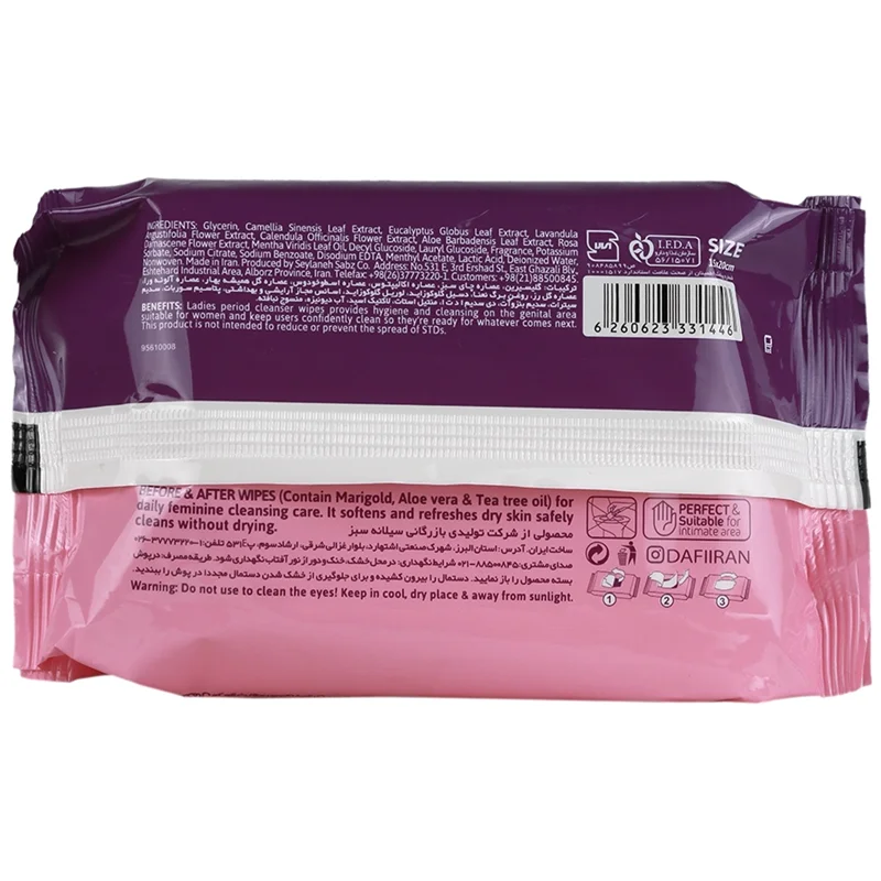 عصاره آلوئه ورا موجود در این دستمال مرطوب نیز، به حفظ رطوبت و کاهش التهاب ناحیه تناسلی کمک می کند. دستمال مرطوب بهداشتی بانوان دافی فاقد ترکیبات حساسیت زا و پارابن بوده و به علت سازگاری با pH ناحیه تناسلی، خارش و آلرژی ایجاد نمی کند.