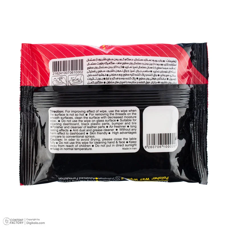 این دستمال مرطوب با خاصیت براق کنندگی و ضد غباری که دارد میتواند برای مدت طولانی داشبورد و لوازم جانبی داخل اتومبیل شما را براق و شفاف نگه دارد. و دارای اسانس با رایحه مناسب، همواره فضای اتومبیل شما خوشبو و معطر میماند. دارای خاصیت ماندگاری طولانی، ضد گرد و غبار، پاک کنندگی و براق کنندگی بالا، بدون ترکیبات پارافین دار، جلوگیری از نشست دوده و گرد و غبار روی داشبورد، جایگزین مناسب اسپری های متداول به دلیل کثیف نکردن شیشه. مناسب برای داشبورد اتومبیل، کنسول، و قطعات چرمی و ABS, عاری از مواد مضر برای داشبورد و پوست دست، تولید شده در سه رایحه