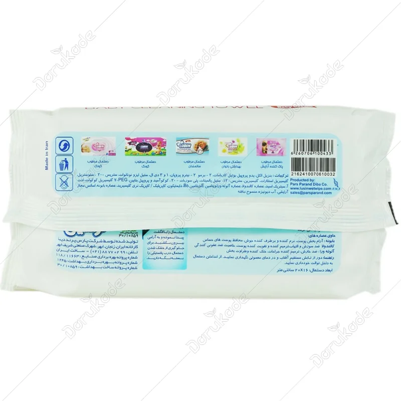 دستمال مرطوب لوسین: حاوی کرم نرم کننده پوست با فرمولاسیون منحصر به فرد و پیشرفته برای پاک کردن و ضد عفونی نمودن پوست بدن و دست های نوزادان و کودکان، به صورت روزانه و به دفعات توصیه می گردد.