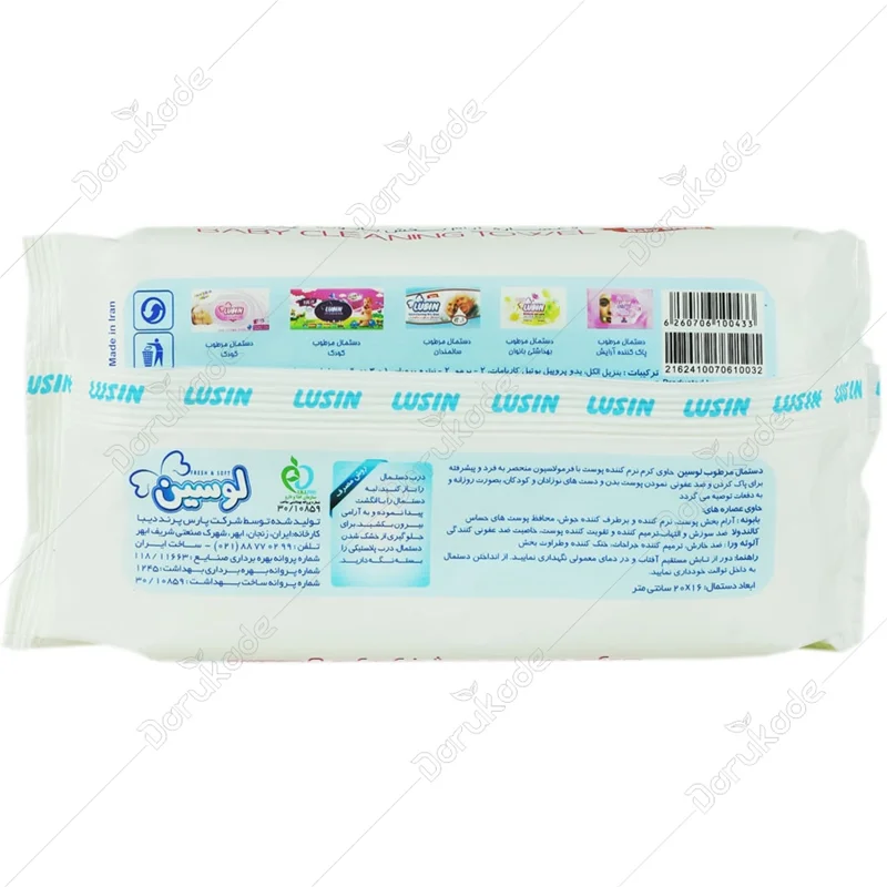 دستمال مرطوب کودک لوسین حاوی کرم بچه مرطوب کننده است که به منظور پاکسازی کودک از آلودگی ها و محافظت از پوست ظریف او با فرمولاسیون پیشرفته در بسته بندی 50 تایی و 60 تایی در ایران توسط شرکت پارس پرند دیبا تولید می شود.