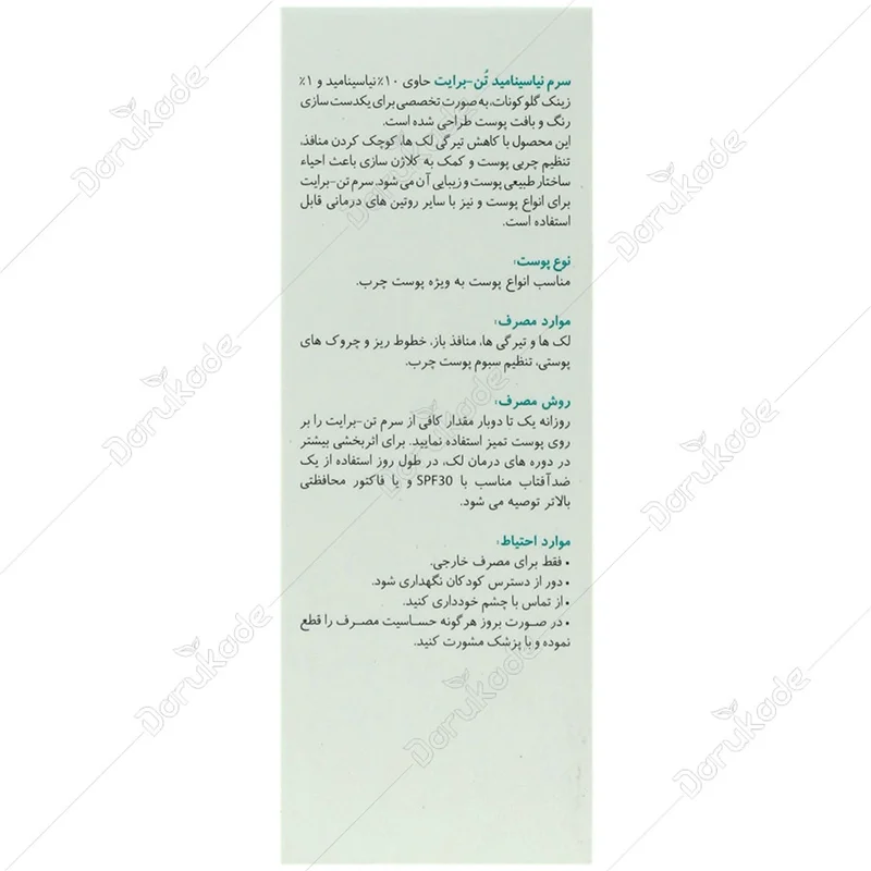 سرم نیاسینامید تن برایت 10 درصد برایت مکس جهت بهبود تن رنگ پوست، بهبود و پیشگیری از پیری زودرس، متعادل سازی ترشحات چربی و رفع منافذ باز توصیه میشود.