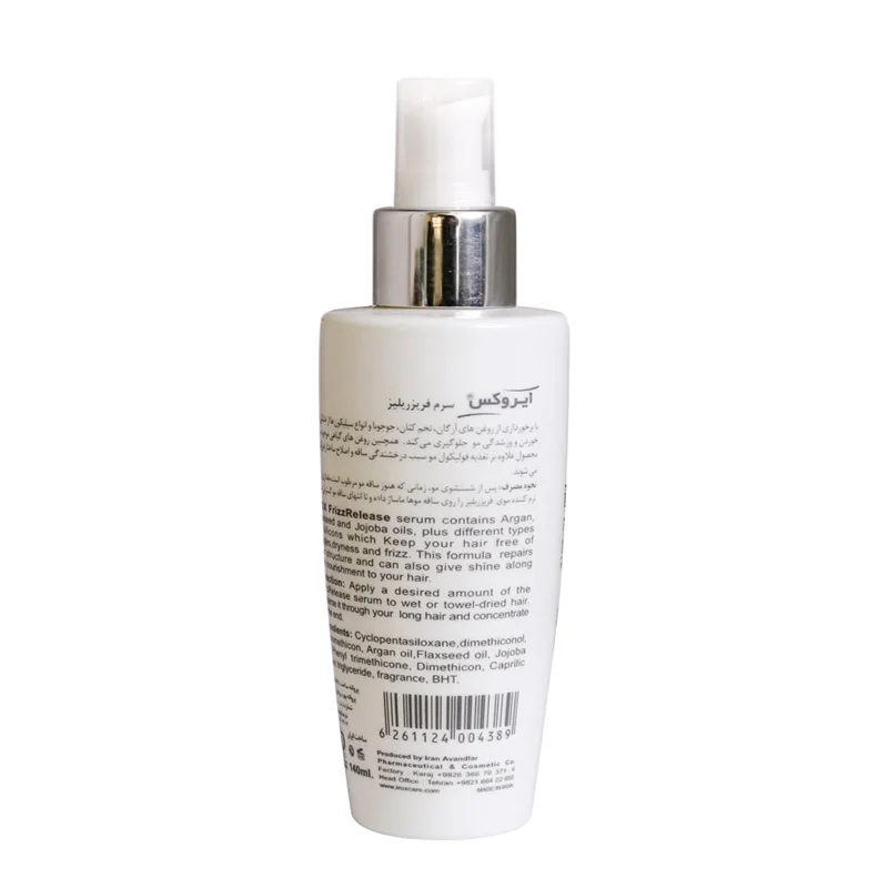 سرم مو فریز ریلیز ایروکس از خشکی، گره خوردن و وز شدن موها جلوگیری کرده و به نرمی و درخشندگی مو نیز کمک میکند. این محصول حاوی روغن آرگان، جوجوبا و تخم کتان است.
