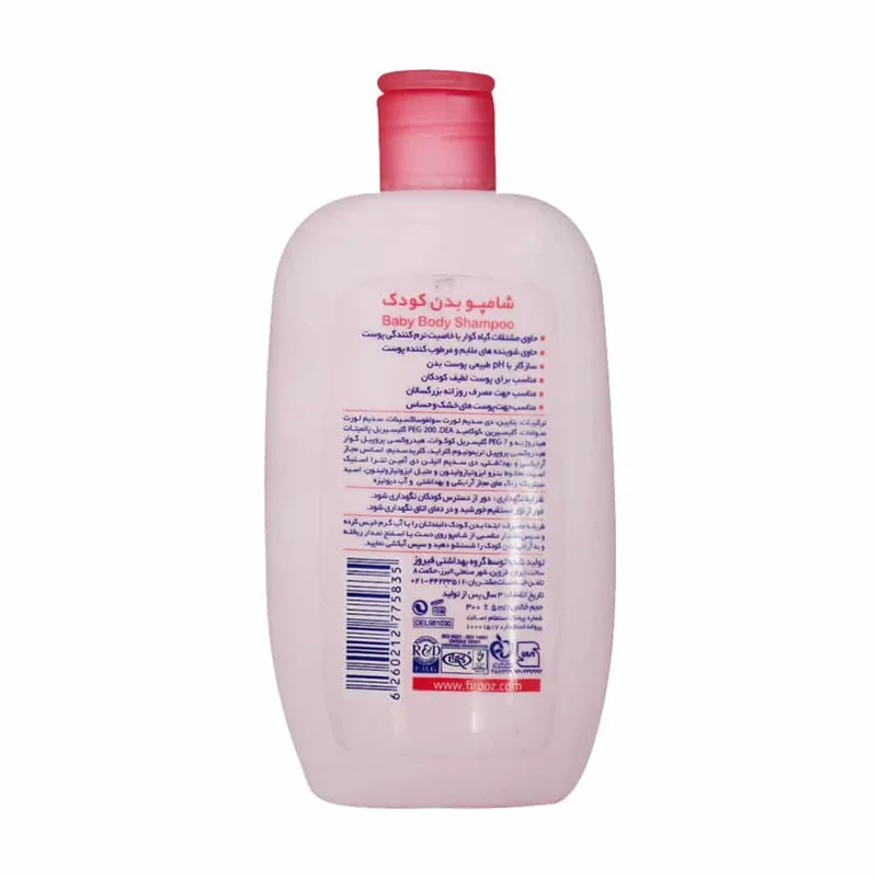 شامپو بدن کودک فیروز حاوی گوار و گلیسیرین شوینده ای ملایم با قدرت پاک کنندگی مناسب می باشد. که باعث نرم و مرطوب شدن پوست می گردد. این محصول دارای pH مناسب و سازگار با پوست بدن بوده و جهت مصرف روزانه کودکان و بزرگسالان مناسب است.