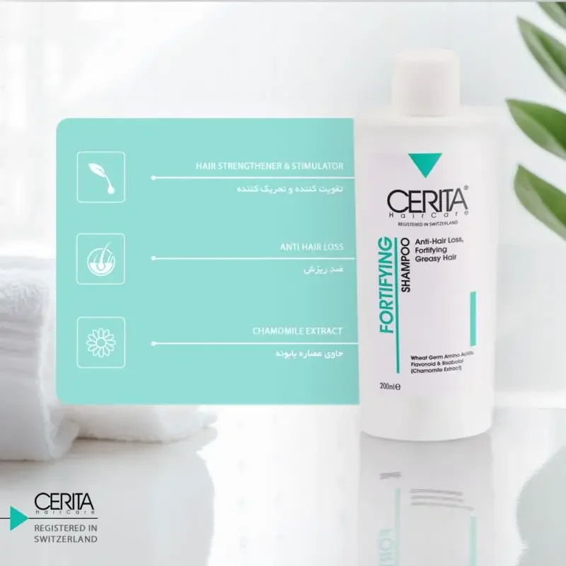شامپو ضد ریزش مناسب موهای چرب سریتا علاوه بر کمک به مهار ریزش مو قادر به ترمیم ساقه مو و تقویت پیاز آن نیز هست و ترکیبات موثر آن شامل عصاره های گیاهی همراه با مخلوطی از ویتامین ها و اسیدهای آمینه طبیعی جوانه گندم است که همگی دارای اثرات تغذیه ای برای مو و پوست سر هستند. این خواص در کنار افزایش خون رسانی به کف سر و فولیکول های مو سبب تقویت و تحریک رویش مو می شوند. این شامپو با بهره گیری از عصاره جوانه گندم به طور قابل توجهی رطوبت پوست سر را افزایش می دهد و علاوه بر خاصیت تقویت کنندگی، به طور خاص برای موهای چرب طراحی شده است و موجب کنترل چربی پوست سر نیز می شود.