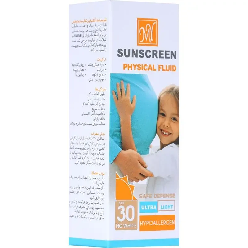این ضد آفتاب بی رنگ بوده و میتوان در زیر آرایش از آن استفاده کرد. همچنین رد سفید روی پوست باقی نمیگذارد و به راحتی قابل استفاده است. فلوئيد ضد آفتاب مای SPF30 مدل Physical به دلیل داشتن مواد معدنی، نداشتن مواد شیمیایی و عطری برای خانمهای باردار و افرادی که پوست حساسی دارند، مناسب است. ضد آفتاب فلوئیدی مای SPF30 مدل Physical ظرفیت 50 میلی لیتر برای انواع پوست مناسب است. این محصول حاوی ترکیبات طبیعی مانند روغن زیتون، روغن کالاندولا، موم زنبور عسل، عصاره بابونه و ویتامین E است. خاصیت ضد التهابی فلوئید ضد آفتاب مای SPF30 مدل Physical ظرفیت 50 میلی لیتر به واسطه دارا بودن عصاره بابونه است. موم زنبور عسل نیز خاصیت ترمیمکنندگی پوست را دارد. با توجه به موارد بالا میتوان گفت که فلوئيد ضد آفتاب مای SPF30 مدل Physical ظرفیت 50 میلی لیتر انتخاب مناسبی برای تمامی افراد به خصوص خانمهای باردار و پوستهای حساس میباشد. این محصول به دلیل داشتن SPF30 محافظت خوبی از پوست در برابر آفتاب دارد. همچنین دارای حجم کافی برای استفاده طولانی مدت است.