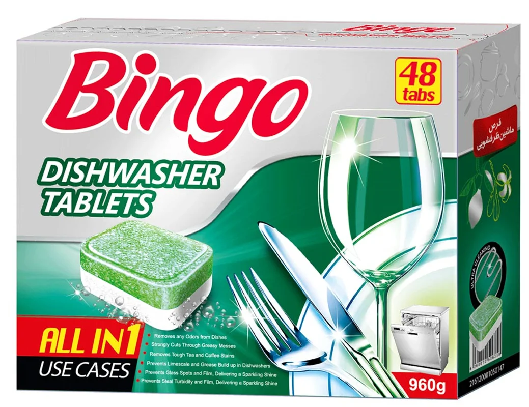 قرص ظرفشویی بینگو «bingo» یکی از انواع قرصهای مرغوب ظرفشویی موجود در بازار داخلی کشور است که بیشتر دارندگان ماشین ظرفشویی از آن استفاده میکنند.