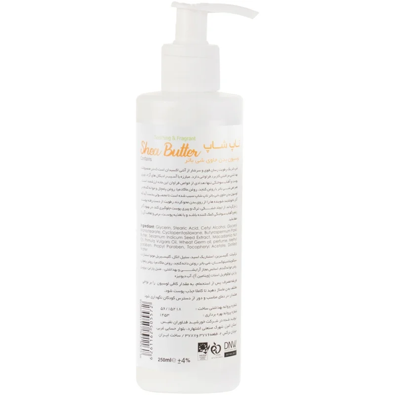 حفظ رطوبت پوست امر مهمی است و از بین رفتن آن باعث ایجاد مشکلات زیادی برای پوست خواهد شد. لوسیون بدن تاپ شاپ حاوی روغن شی باتر با ظرفیت 250 میلیلیتر، محصولی ایدهآل برای مرطوبکنندگی و تغذیه پوست بدن است. روغن شی باتر موجود در این محصول حاوی خواص نرمکنندگی و آبرسانی پوست است.