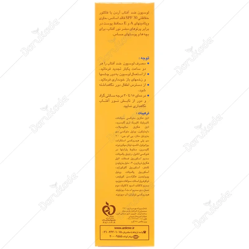 لوسیون ضد آفتاب کودکان آردن، محافظ پوست در برابر پرتوهای مضر ماورای بنفش UVA و UVB است. این محصول عاری از اسانس و نگهدارنده های مضر می باشد. بنابراین حتی برای بزرگسالان با پوست های حساس مناسب است. این لوسیون مناسب مواد مرطوب کننده موثر و امولسیون غیر یونی جهت کاهش التهابات پوستی می باشد.