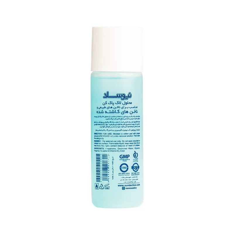 یک پد پنبه ای را با مقدار مناسب از محلول لاک پاک کن نیوساد مرطوب کنید. پد مرطوب شده را ۳ ثانیه روی ناخن ها نگه دارید سپس به آرامی سطح ناخن ها را پاک نمایید.