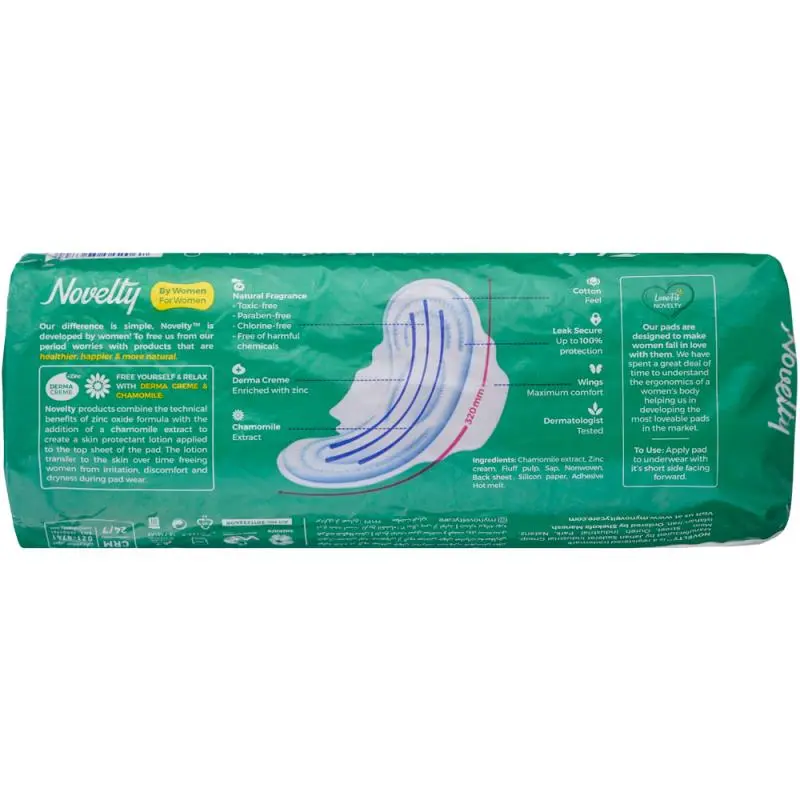 نواربهداشتی بالدار ناولتی حاوی عصاره بابونه بر اساس ارگونومی بدن بانوان طراحی شده است. جنس نواربهداشتی بالدار ناولتی کتان و پنبه است همراه با عصاره بابونه و کرم زینکاکساید که در طول مدت استفاده احساس آرامش و راحتی در روز را به ارمغان میرساند. این محصول بسیار ضخیم با جذب 5 قطره است و سایز آن بزرگ برای استفاده در شب بسیار ایمن و راحت طراحی شده.