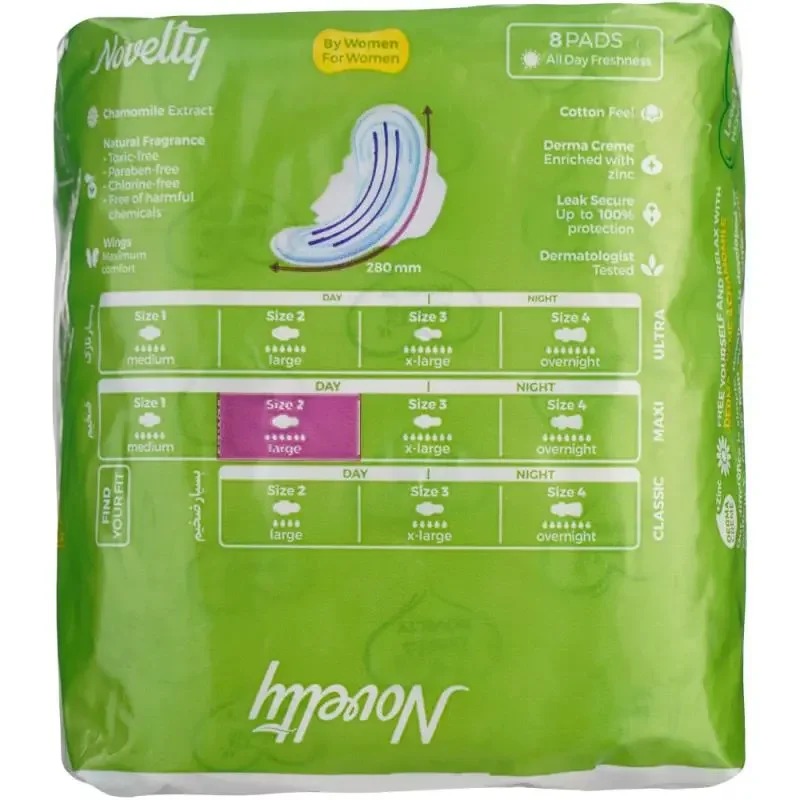 سایز بزرگ این نوار بهداشتی برای افرادی که نیاز به جذب بالاتر دارند، بهویژه در روزهای سنگینتر قاعدگی، بسیار مناسب است. نوار بهداشتی بالدار ناولتی دارای لایههای جاذب قوی است که میتواند مایعات را به سرعت جذب کرده و از احساس خیسی جلوگیری کند. این ویژگی باعث ایجاد حس راحتی بیشتر و جلوگیری از بوی نامطبوع میشود. سطح نوار بهداشتی از مواد نرم و لطیف تهیه شده که برای پوست حساس بانوان مناسب بوده و مانع از ایجاد حساسیت میشود.