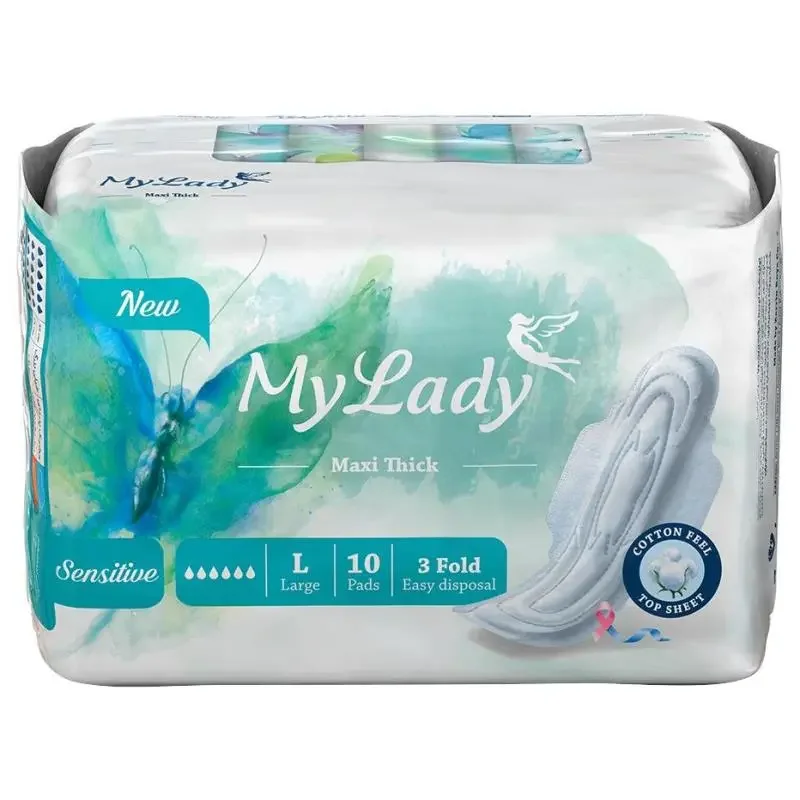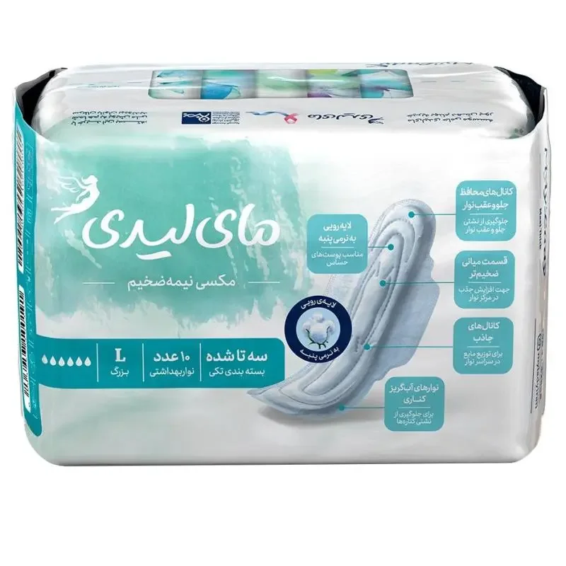رایج ترین نوع نوار بهداشتی ها که دارای کمترین میزان نشتی و بیشترین میزان راحتی در حین استفاده هستند، نوار بهداشتی های بالدار هستند. نوار بهداشتی بالدار مناسب پوست حساس سایز بزرگ مای لیدی مدل Maxi Thick بسته 10 عددی نیز یکی از این نوع نوار بهداشتی هاست که دارای دو بال در طرفین خود است. این دوبال به لباس زیر چسبیده و مانع جابجایی آن میشود. خصوصیات بارز این نوار بهداشتی، ضد حساسیت بودن آن و استفاده از جنس پنبه در لایه رویی محصول است. این دو ویژگی سبب شده تا تمام افراد، حتی آنهایی که دارای پوست بسیار حساس و تحریک پذیر هستند نیز بتوانند از این محصول استفاده کنند. این نوار بهداشتی دارای قدرت جذب بالا بوده و قسمت میانی آن دارای ضخامت بیشتری است تا بتواند میزان جذب آن را افزایش دهد. همچنین کانال های هدایت کننده ای در ساختار این محصول وجود دارد که سبب میشود تا مایع جذب شده در سراسر نوار پخش شده و از محلی خاص نشتی نکند. نوارهای آبگریز کناری این محصول و کانال های محافظ عقب و جلو نیز از دیگر عواملی هستند که به جلوگیری از نشتی کمک میکنند و سبب میشوند تا بتوان از آن حتی در طول شب نیز استفاده کرد.