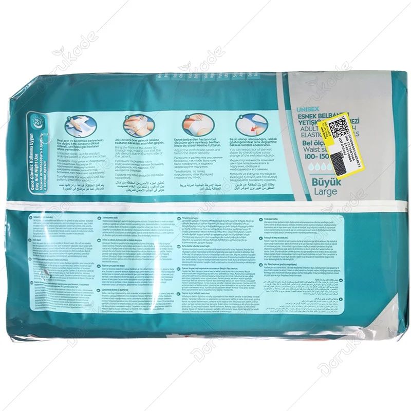 پوشک را باز کنید و با اطمینان از اینکه لبه های میانی و ضد نشت به سمت داخل تا شده، به آرامی زیر فرد قرار دهید.قسمت جلوی پوشک را از بین پاها رد کرده و بالا بیاورید.با توجه به اندازه کمر شخص دو طرف پوشک را کشیده و طوری قرار دهید که شخص راحت باشد و سپس پوشک را ببندید.با بررسی تغییر رنگ نشانگر رطوبت، می توانید زمان تعویض و میزان رطوبت پوشک را متوجه شوید.