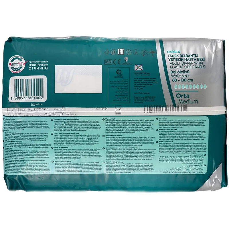پوشک را باز کنید و با اطمینان از اینکه لبه های میانی و ضد نشت به سمت داخل تا شده، به آرامی زیر فرد قرار دهید.قسمت جلوی پوشک را از بین پاها رد کرده و بالا بیاورید.با توجه به اندازه کمر شخص دو طرف پوشک را کشیده و طوری قرار دهید که شخص راحت باشد و سپس پوشک را ببندید.با بررسی تغییر رنگ نشانگر رطوبت، می توانید زمان تعویض و میزان رطوبت پوشک را متوجه شوید.