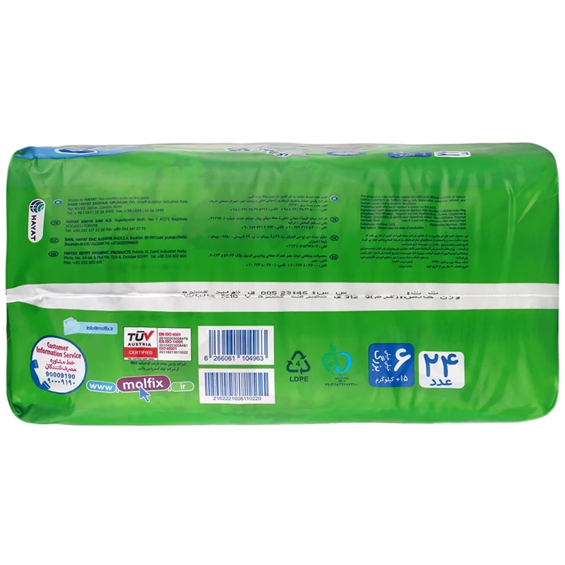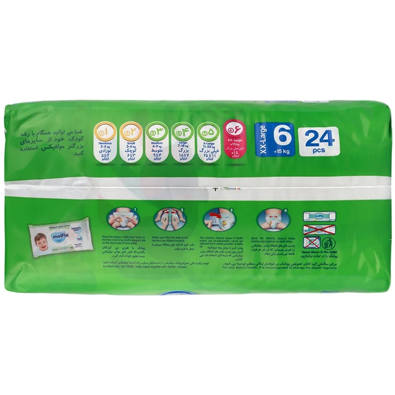 پوشک را زیر بچه بگذارید تا طرح های جذاب آن به سمت جلو باشد. مطمئن شوید که لایههای محافظ عمودی به سمت داخل تا خورده باشند. پودر کرم یا روغن بچه هیچگونه اثری روی چسبهای بغل انعطافپذیر مولفیکس که بارها قابل استفادهاند نمیگذارد. چسبهای بغل انعطافپذیر مولفیکس را طوری بچسبانید که در هر دو طرف فاصله یکسان باقی بماند.