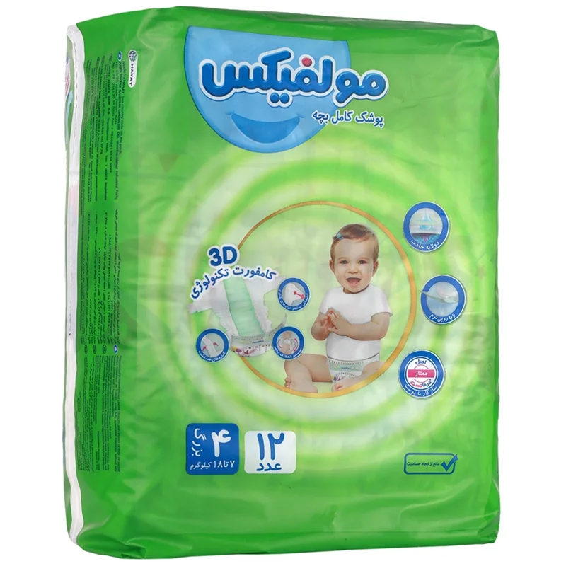 از آنجایی که پوشک های نوزادان بر اساس وزن کودک دسته بندی میشوند، پوشک مولفیکس سایز 4 برای نوزادان 7 تا 18 کیلوگرم مناسب است و در بسته بندی های 12، 25، 34 و 40 عددی موجود میباشد.