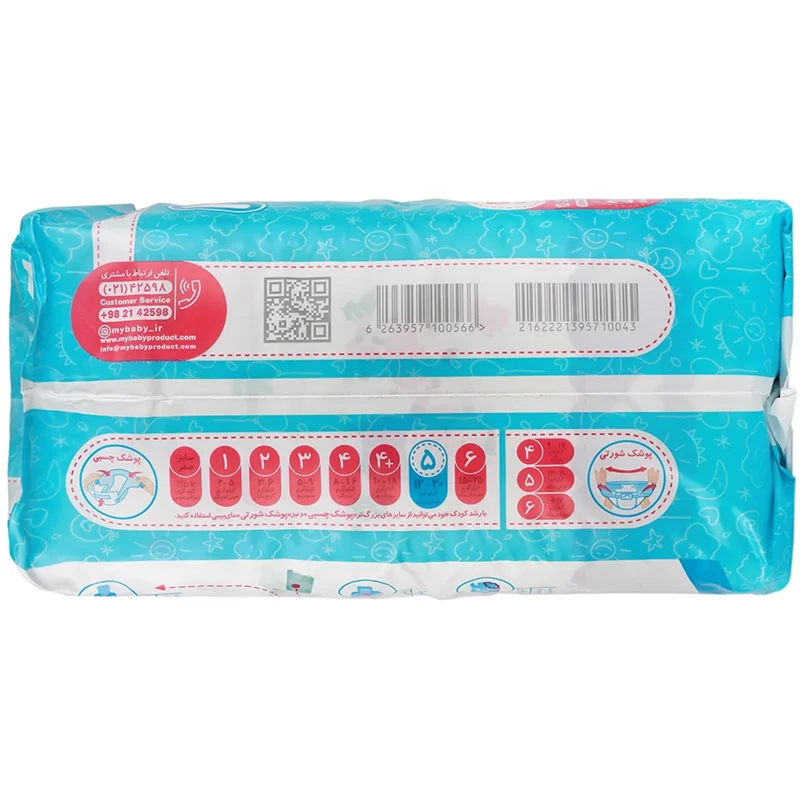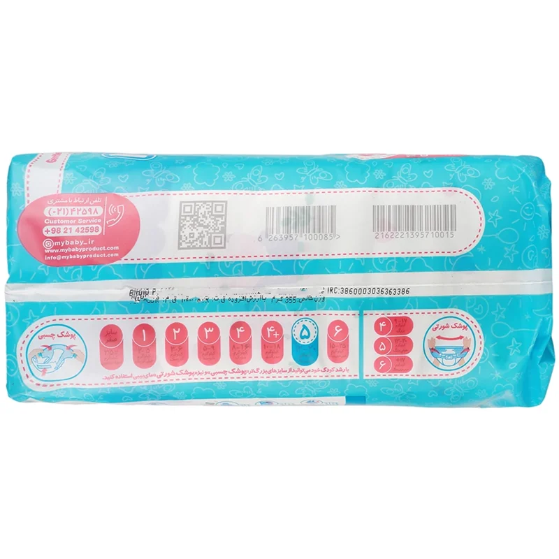 - پوشک مای بیبی سایز 5 دارای لایه رویی نرم، راحت و دارای قدرت جذب بالا