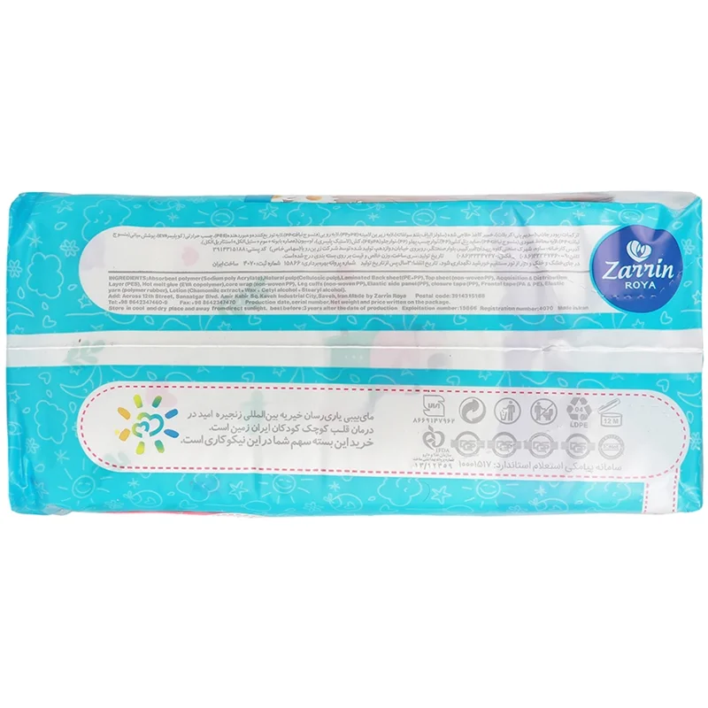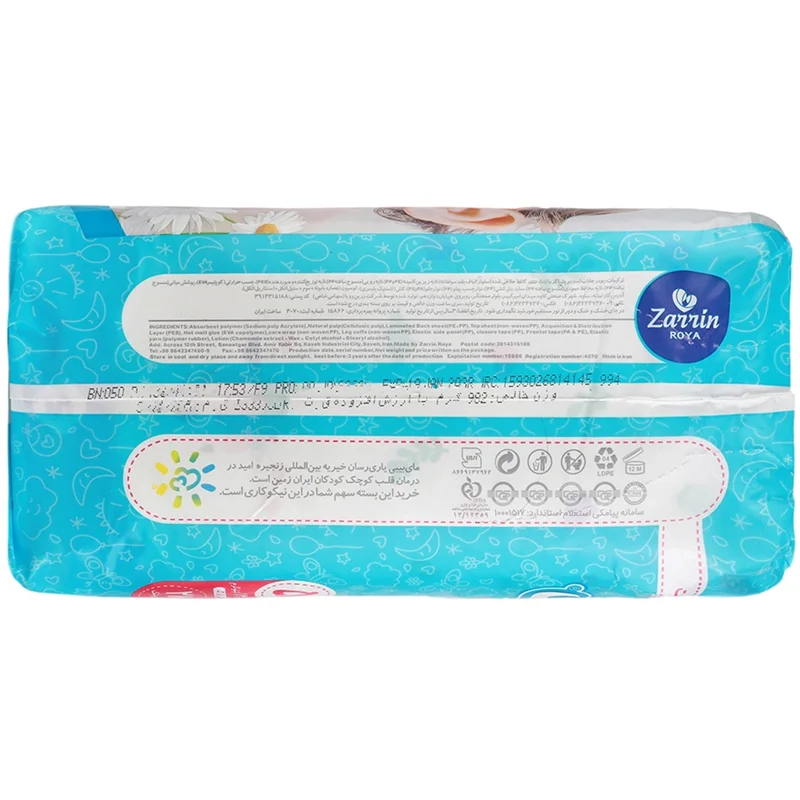 خمیر کاغذ حلاجی شده (سلولز الیاف بلند سولفاته)، پودر جاذب (سدیم پلی آکریلات)،لایه زیرین (PP و PE)، لایه رویی ( منسوج نبافته PP)، لایه توزیع کننده و عبور دهنده ( PES)، چسب حرارتی(کوپلیمر)، پوشش میانی ( منسوج نبافته PP)، لایه حافظ عمودی ( منسوج نبافته PP)، نوار چسب پهلو (PP)، نوار جلو (PE و PA)، کش ( لاستیک پلیمری)، لوسیون ( عصاره بابونه، موم، ستیل الکل، استئاریل الکل)