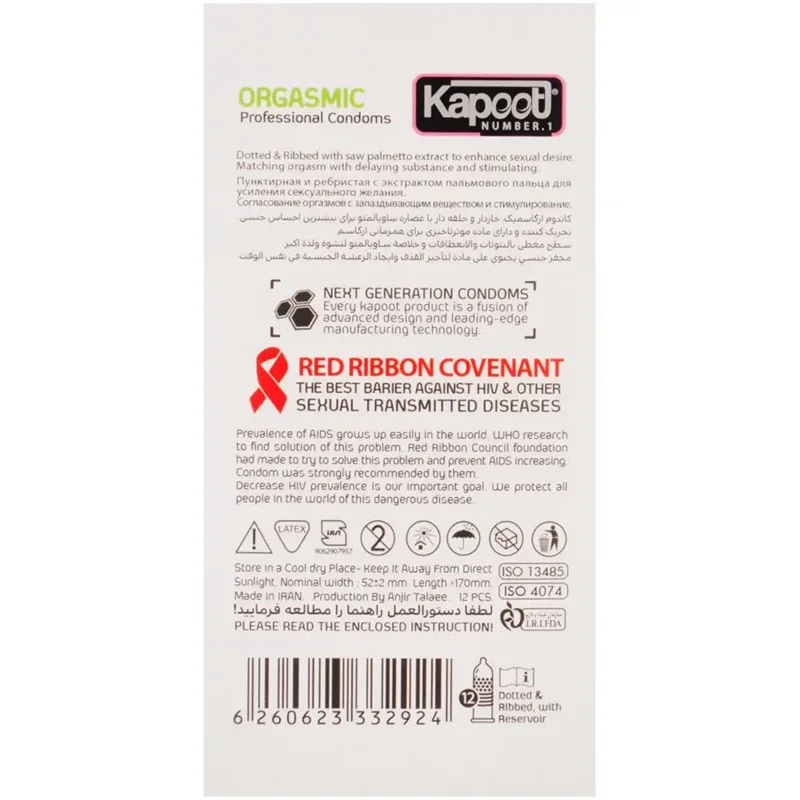 تجربهای متفاوت و هیجانانگیز با کاندوم کاپوت مدل Orgasmic! طراحی شده برای افزایش لذت و تحریک، این بسته 12 عددی لحظات فراموشنشدنی را برای شما و شریکتان به ارمغان میآورد. با استفاده از مواد با کیفیت و ایمنی بالا، بهترین انتخاب برای ارتقاء تجربه جنسی و ایجاد حس نزدیکی واقعی است.