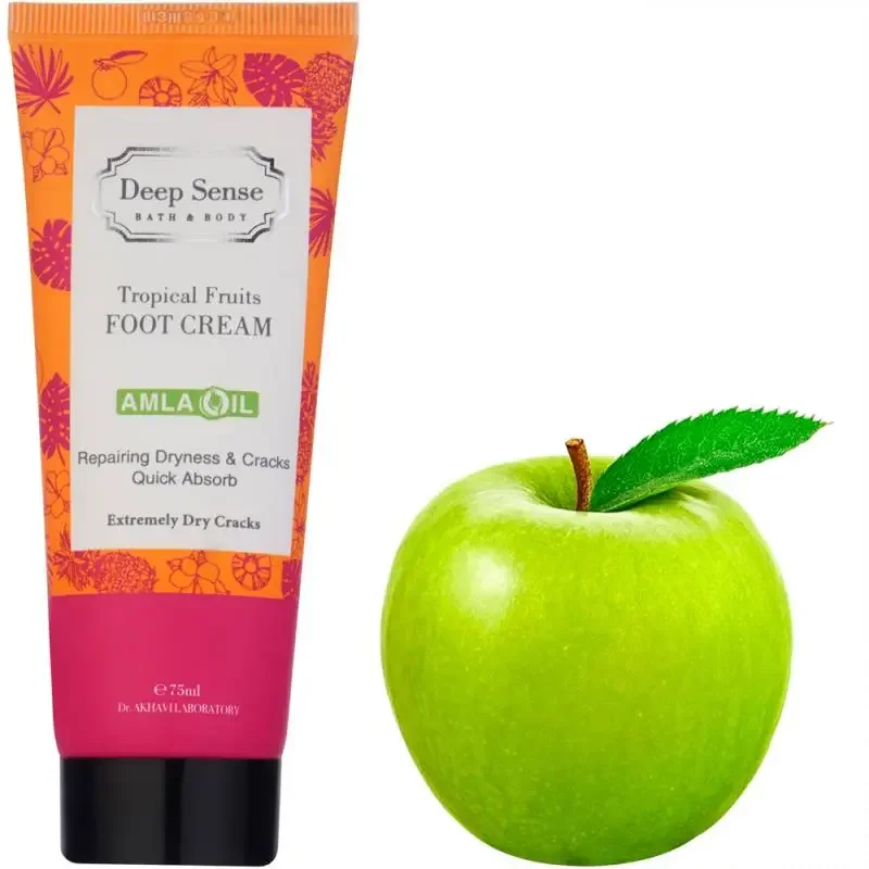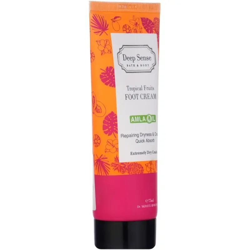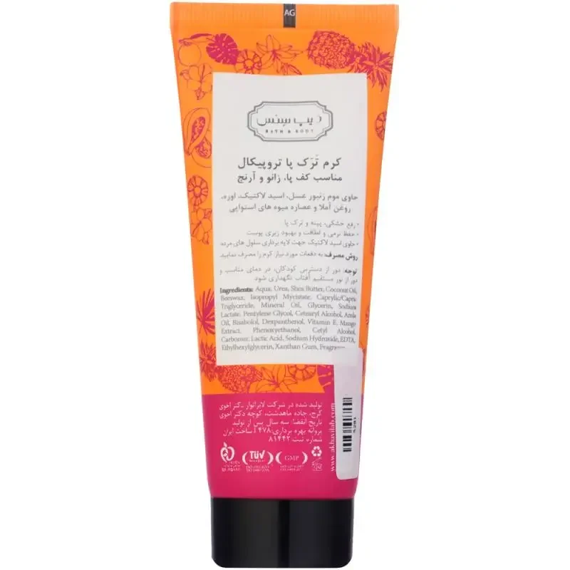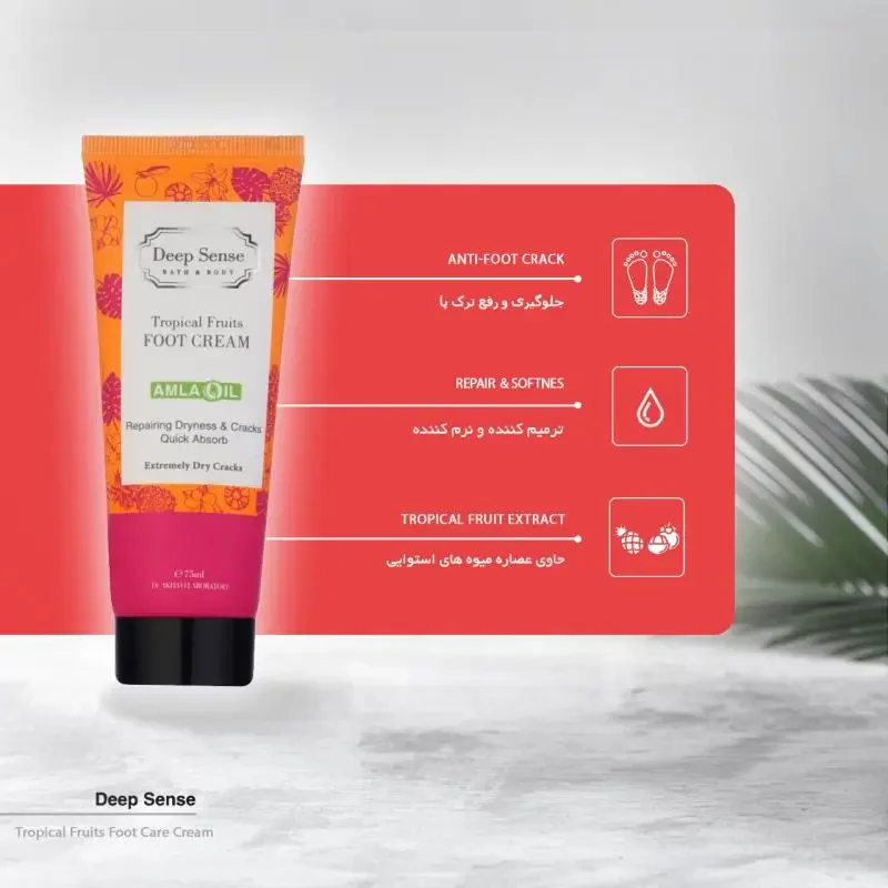 کرم ترک پا دیپ سنس مدل Tropical Fruits حاوی موم زنبور عسل، اسید لاکتیک، اوره، روغن آملا و عصاره میوه های استوایی است که در رفع خشکی و ترک های کف پا بسیار مناسب است. این محصول از سلول های مرده و آسیب دیده پوست لایه برداری می کند و با آبرسانی عمقی و حفظ رطوبت و تقویت پوست پا، باعث نرمی و لطافت آن می شود.