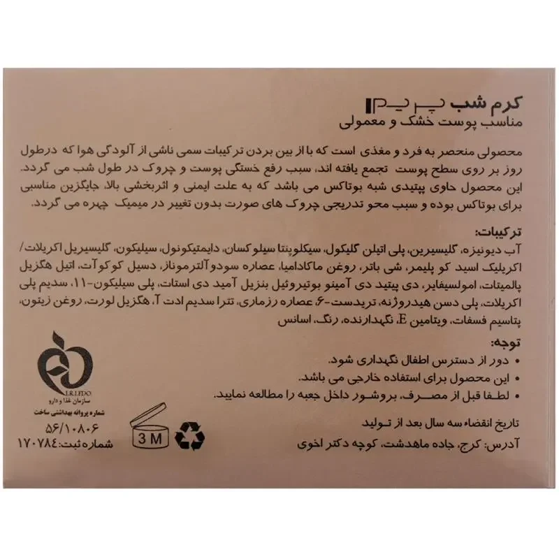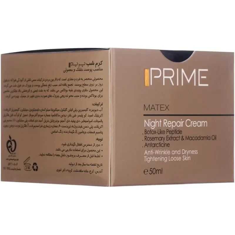 کرم شب پریم علاوه بر عملکرد دوگانه ی خود که شامل خاصیت ضد چروکی و مرطوب کنندگی است، تحت عنوان کرم شب به بازار عرضه شده است که موجب تمایز با سایر مجصولات مشابه شده است.کرم های شب نسبت به کرم های روز دارای اثربخشی و قدرت بیشتری هستند، به این سبب که مواد مغذی و ویتامین های موجود در این محصولات در هنگام شب به پوست منتقل شده و پوست نیز در هنگام شب و موقع خواب بیشتر از روز ، قابلیت جذب و اثرپذیری دارد . این محصول حاوی عصاره های زیتون، رزماری، ماکادمیا و ویتامین E بوده که سرشار از آنتی اکسیدان و سایر مواد مغذی هستند که علائم پیری و چروک های پوستی را به تعویق انداخته، با پیری آن مبارزه کرده، سبب جلوگیری از آکنه، اگزما و و جوش شده و در نهایت موجب رطوبت رسانی و نرمی پوست میشود که خود از اصلی ترین عوامل ایجاد پیری پوست است.
