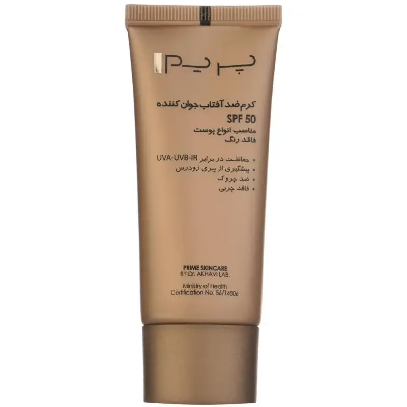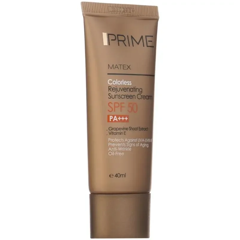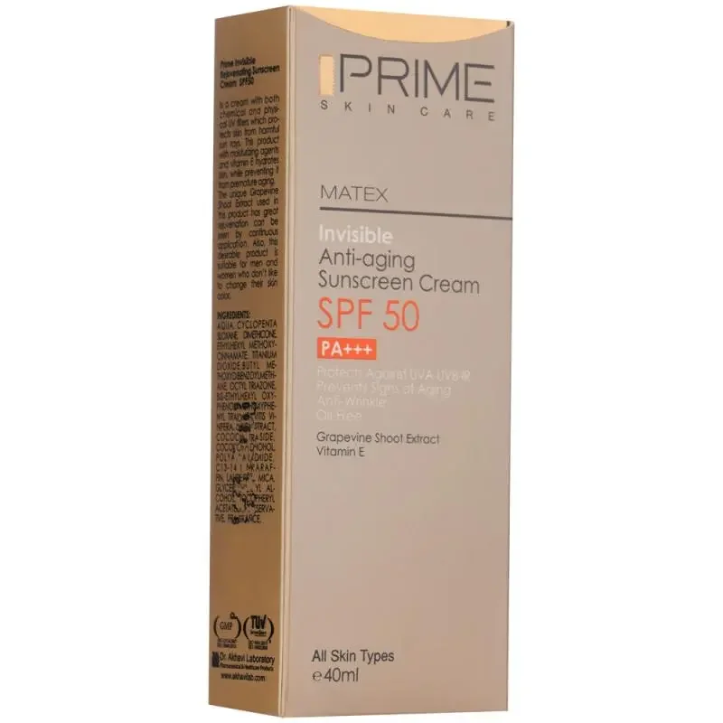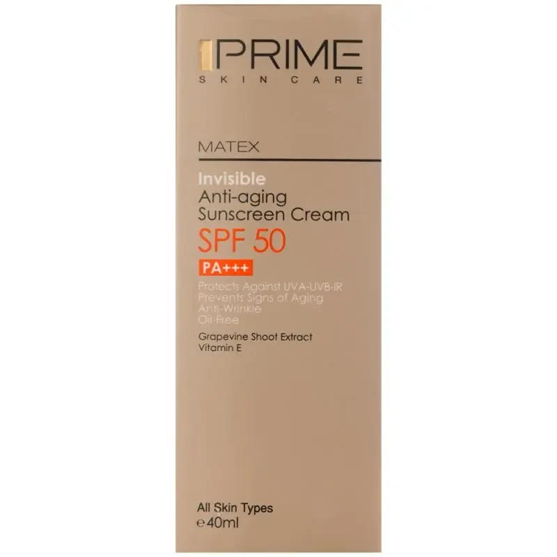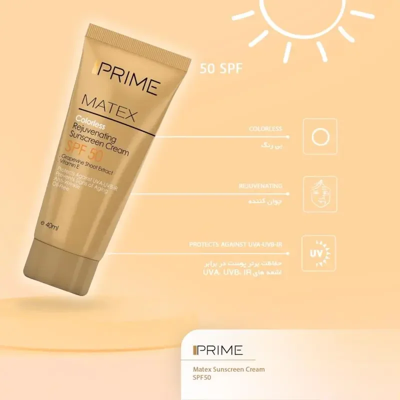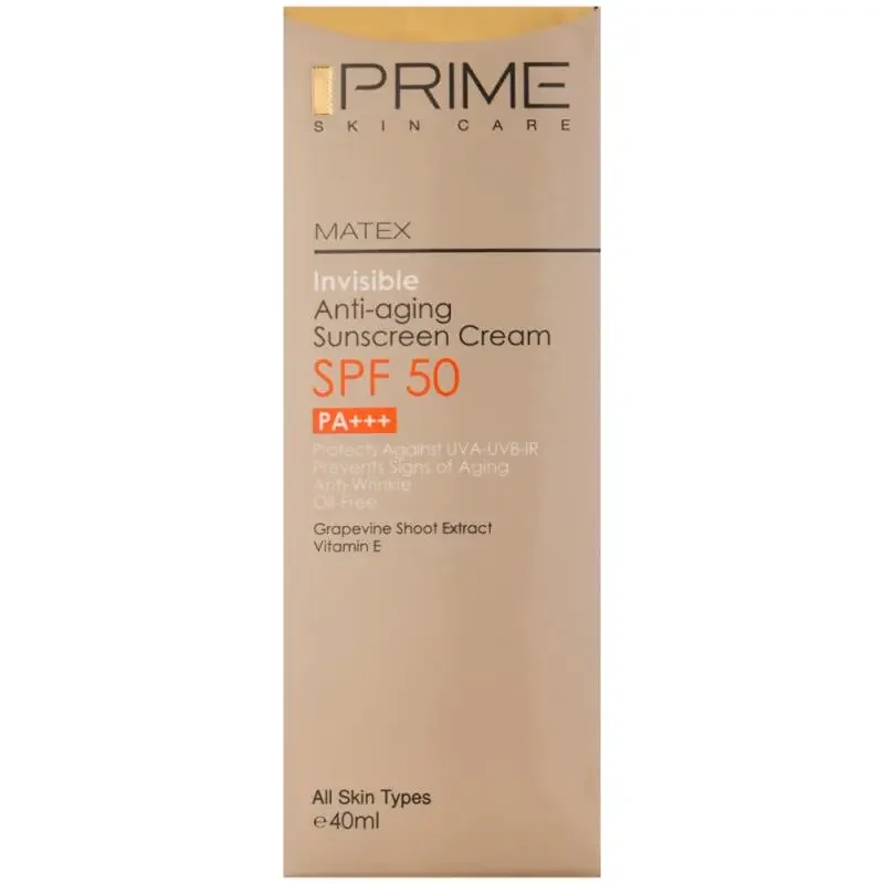 کرم ضد آفتاب پریم SPF50 مدل Matex با فرمولاسیونی پیشرفته و بهره گیری از فیلترهای حفاظتی، از پوست در برابر اشعه های مضر آفتاب به طور موثری محافظت می کند. همچنین این محصول حاوی عصاره تاک بوده است که خاصیت ضد چروک و جوان کننده دارد. عصاره تاک موجود در ترکیبات کرم ضد آفتاب پریم با بهبود در بافت ارتجاعی پوست باعث کاهش چین و چروک و افزایش استحکام پوست شده و موجب احیا کردن و شاداب نگه داشتن پوست صورت می شود. همچنین ویتامین E موجود در این کرم به عنوان یک آبرسان رطوبت لازم را به پوست می رساند. کرم ضد آفتاب پریم با سه عملکرد همزمان نیاز روزانه فرد به محصولات ضد آفتاب، ضد چروک و مرطوب کننده را برطرف می کند. این محصول بدون رنگ بوده است و برای استفاده خانم ها و آقایان مناسب است.