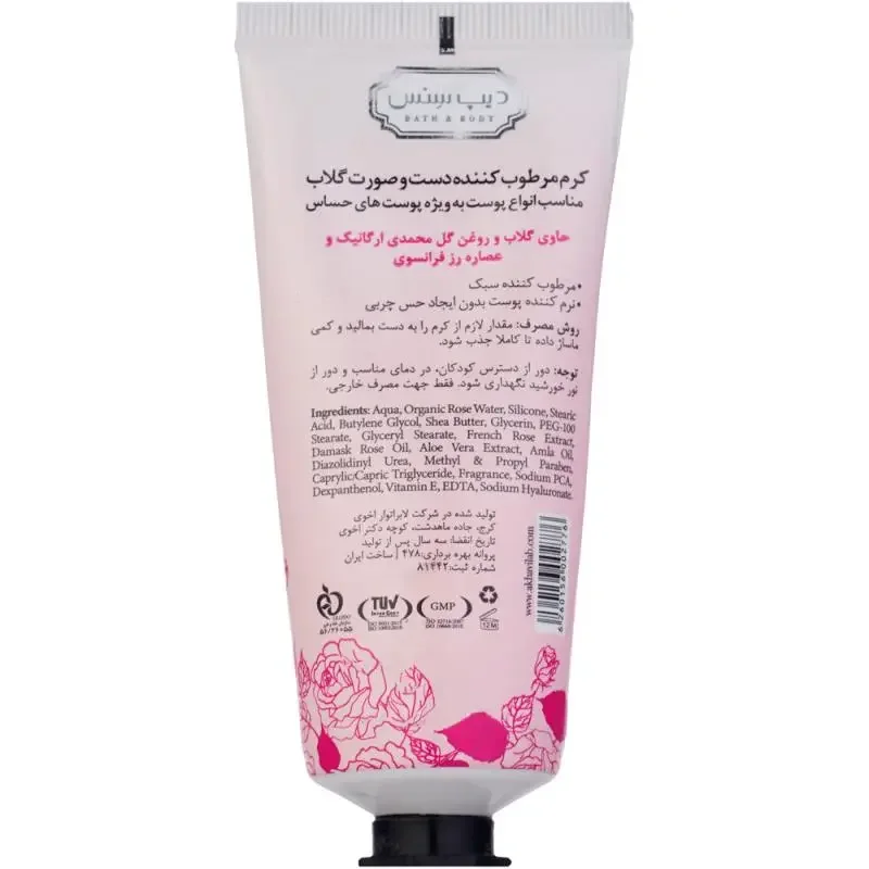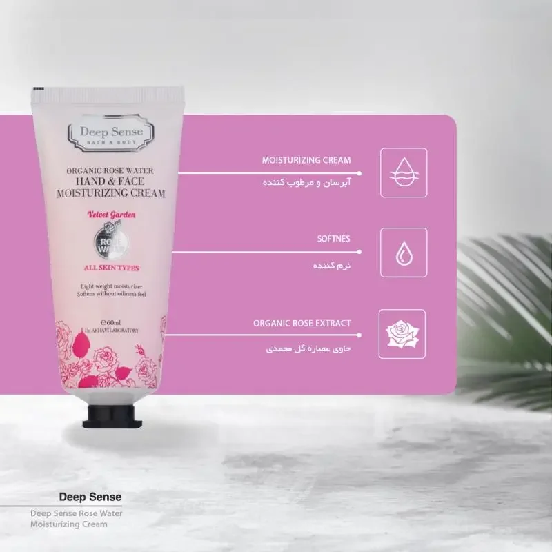 ماده مؤثر در این مرطوب کننده گلاب است که از شگفت انگیزترین عناصر برای سلامت پوست است و در بسیاری از مواد آرایشی بهداشتی مربوط به پوست استفاده میشود. بارزترین ویژگی این ماده خاصیت مرطوب کنندگی آن است که در رابطه با این محصول از اهمیت ویژهای برخوردار است. این عصاره طبیعی موجب نرمی و لطافت پوست شده، از زبری و پوسته شدن پوست جلوگیری میکند، همچنین به دلیل داشتن خواص آنتی باکتریال با جوش و آکنه مبارزه کرده و سبب تسکین التهاب، قرمزی و حساسیت پوست میشود. از خصوصیات مهم این عصاره داشتن ویتامین C است که سبب ایجاد خاصیت ضدآفتابی و محافظتی در این محصول شده و کرم مرطوب کننده گل محمدی دیپ سنس را به یک محصول با خواص چندگانه تبدیل کرده است.