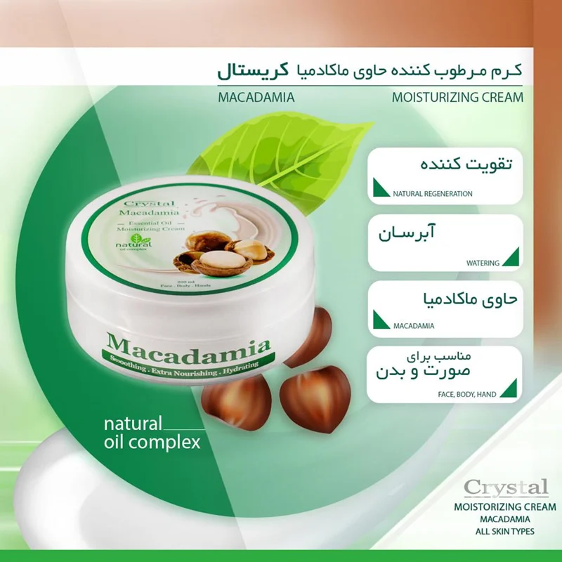 مغز ماکادمیا بسیار مغذی و انرزی را بوده و حاوی اسید اولنیک (امگا9) میباشد که از پوست در مقابل اثرات مخرب رادیکالهای آزاد محافظت مینماید.اسید اولنیک همچنین خاصیت ضدالتهابی دارد و با نفوذ به اعماق لایه بیرونی پوست،آن را به مدت طولانی مرطوب نگاه میدارد.این روغن سرشار از اسید لینولنیک (امگا6) نیز میباشد که پوست را مرطوب و لطیف نموده و باعث تحریک، رشد و بازسازی سلولها شده و برای رفع چین و چروک و سایر آسیب دیدگی های پوستی بسیار مفید می باشد.