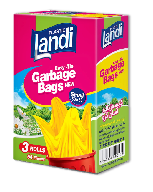 کیسه زبالههای آسانگره لندی از مواد نو و بدون بو با دوخت باکیفیت و بدون نشتی تهیه شده است. کیسه زباله آسان گره لندی دارای چهار لبه جهت سهولت در گره زدن کیسه زباله است. این محصول در جعبه مقوایی شامل 3 عدد رول، تعداد 54 عدد کیسه زباله سایز کوچک ، به ابعاد 50*60 سانتی متر تولید شده است که دردسترس مشتریان میباشد.